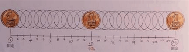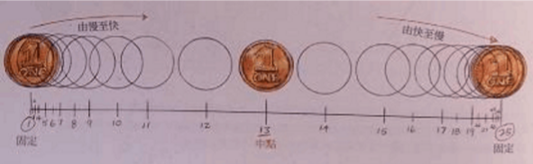 硬币同样是花一秒钟的时间通过屏幕。控制时间不变,间距却有了变化,动作也有了莫大差异,两者起点相同,同样通过中点,间距却大不一样,所表现出的效果也大相径庭。