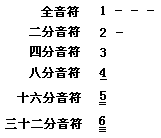 音没有加短横线的为1/4音符,在后加叫短横线为增时线,每加一条表示增加原时值的2倍,加一条为1/2音符,加两条为全音符。在下面加横短线为减时线。每加一条缩短原时值的1/2,加一条为1/8音符,加两条为1/16音符。