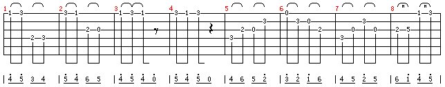 8.第八小节是滑音,滑音第一个音的左手指按好,右手拨出,然后不离开指板滑向下个音位,下行同样由第一个音滑向第二个音,也不离开指板。