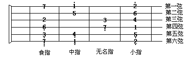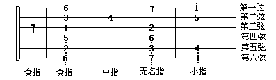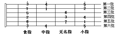 5.音阶练习要求做到想到什么音就可以按到住那个音,这需要我们艰苦的训练,每天都弹上几遍。左手必须按上图的指法,右手用i,m等交替的拨弦(如用Pick也可以)。