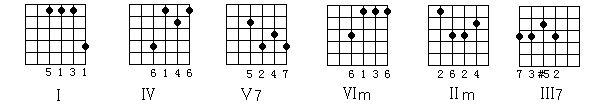 3.这样我们就可以推出C调在0把位,E调在第四把位,G调在第七把位,A调在第九把位。