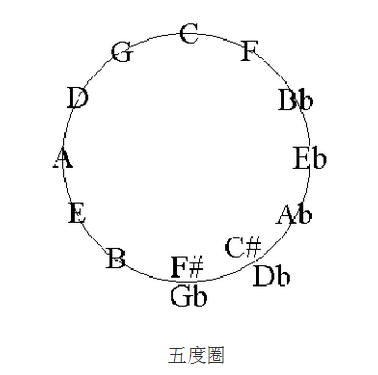 也就是说,从任一个音往上或往下数完全五度,数完12个之后又会回到同一个音,这就叫做五度圈(如下图)。所以以后听到两个升的大调一定是D大调,升F升C:两个降的大调一定是Bb大调,降B降E。