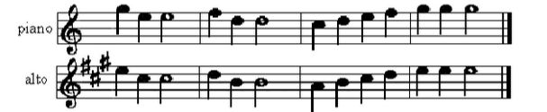 另外一个移调的例子是移调乐器。非C调的乐器都称为移调乐器,例如 Eb调的alto sax,Bb调的tenor sax、小号、竖笛等。移调乐器的Do并不是钢琴上的C,例如:alto sax吹Do,是钢琴上的Eb,所以称为Eb调乐器。如果钢琴跟alto sax要演奏同一个旋律,他们的之中有一个的谱要移调,演奏出来才会是相同的音。上图的例子就是钢琴跟alto sax演奏相同的音时,他们的谱是不同的。
