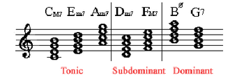 Dominant 属和弦功能,五级、七级是最不安定的和弦 Subdominant 下属和弦功能,二级、四级其不安定性次于属和弦 Tonic 主和弦功能,一级、三级、六级属于较安定的和弦