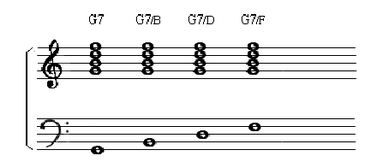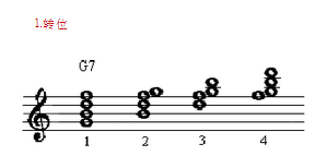 所谓转位就是把和弦的位置改变,上图以G7 为例,本来在最下面的G移到最上面变成B D F G,称为第一转位。再同样把最下面的音往上移变成D F G B,称为第二转位。再往上移F G B D称为第三转位。