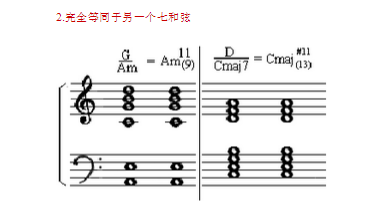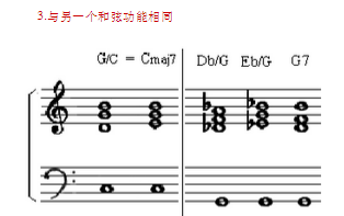 例如:Am/F = Fmaj7,F/D = Dm7。这个不用解释自己排排看就知道。问题是,既然等于另一个和弦,为什么不就直接写Dm7,而要写成F/D?这是因为读起来比较容易,比较快的缘故。 keyboard在弹奏时只要注意上面的和弦,下面的bass音就交给bass手了,所以keyboard手会比较省事。尤其遇到比较复杂的和弦时,更能显出他的作用。以上图上三和弦结构为例,如果看到一个Am11(9)的和弦,要马上想到11音跟9音,反应可能会慢一些。但如果写成上面G下面Am,就可以很快的弹出所要的和弦。右边的Cmaj#11(13)也是一样的例子。