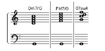 中使用这两个和弦可达到G7sus4的效果。第一个和弦是上面用二级minor7(对C而言是二级),根音用五级,比G7sus4多出一个音A,是G7sus4的tension 9,是效果不错的音。第二个和弦上面用四级minor7(对C而言是四级),根音用五级,多出A、E,是G7sus4的tension 9跟tension 13。往后的单元中,会再说明tension的使用。