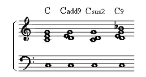 以C调为例九度音是D 而二度音也是D,有分别吗?理论上九度的D应比二度的D高八度,但先前说过,除了bass必须是根音,和弦部份是允许转位的,所以九度和二度变成没有分别了。然而有时功能上是有些不同的,以下就是说说sus2,add9有何不同: