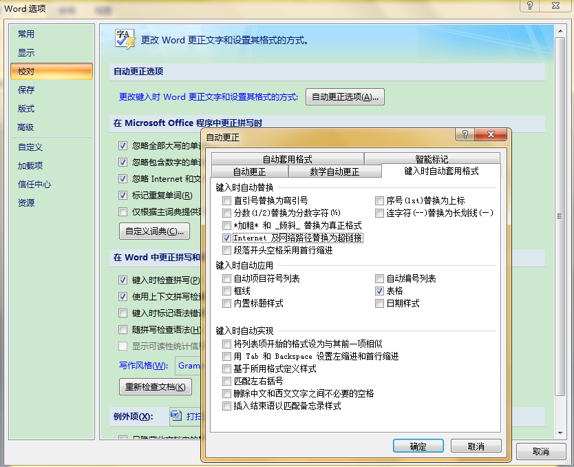 说明:Office2007中有效。位于“选项”-》“校对”-》“自动更正选项”-》“键入时自动套用格式”。