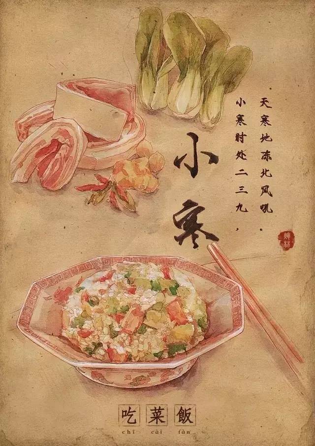 到了小寒,老南京一般会煮菜饭吃,菜饭的内容并不相同,有用矮脚黄青菜与咸肉片、香肠片或是板鸭丁,再剁上一些生姜粒与糯米一起煮的,十分香鲜可口。其中矮脚黄、香肠、板鸭都是南京的著名特产,可谓是真正的'南京菜饭',甚至可与腊八粥相媲美。