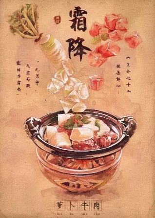 不少地方都有霜降吃牛肉的习俗。例如广西玉林,这里的居民习惯在霜降这天,早餐吃牛河炒粉,午餐或晚餐吃牛肉炒萝卜或是牛腩煲之类的来补充能量,祈求在冬天里身体暖和强健。