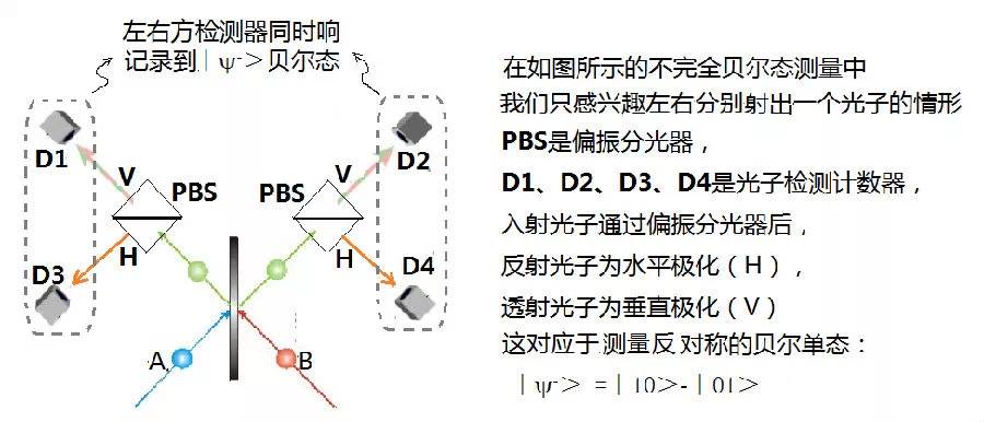如图所示,在光子离开分光器(BS)出来的两个途径上各置一个偏振分光器(PBS)。光子经过PBS后,按概率分成垂直偏振和水平偏振两条路。左右两边的光子的两种可能性分别由侦测器 D1、D3 和 D2、D4 探测。我们仅仅当左右方两个检测器同时侦测到光子时才作记录,这就是所谓的同时符合测量(coincidence measurement)。这样的设置意谓每一出来的途径必须有一个光子,所以只有两个可能:两个光子经过分光器时都继续前进或同时被反射,因为这两种情形是无法区分的,所以出来后的两光子态是这两种情形的状态的线性叠加,其振幅大小相同而符号相反。因此,在符合测量设置下,只有贝尔单态|y->是允许的。这时,我们测量到了贝尔单态,而原来两光子之状态也崩溃成贝尔单态。