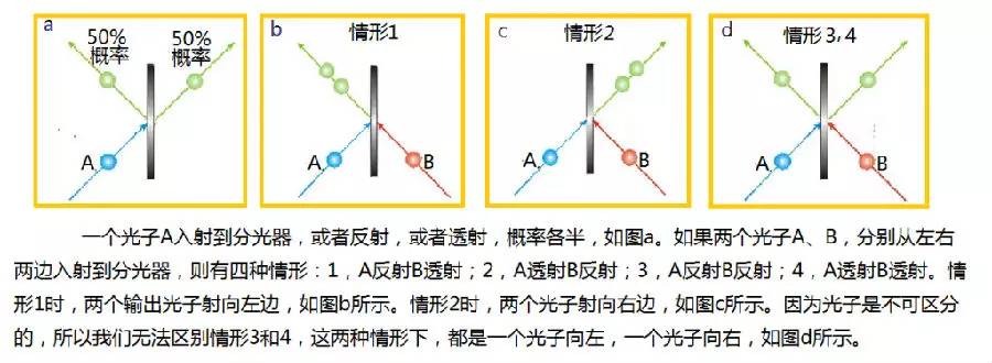 现在考虑两个光子 A 和 B,分别从左右两边入射到分光器。当两光子同时抵达分光器时,两光子之波包相互重叠,因而产生干涉效应。它们经过分光器后有四种情形:1,A 反射、B 透射;2,A 透射、B 反射;3,A 反射、B 反射;4,A 透射、B 透射。第一种情形,两个输出光子同时射向左边,如图 b 所示。情形 2 时,两个光子同时射向右边,如图 c 所示。但是,我们无法区别第三和第四这两种情形,因为光子是不可区分的。我们不知道,从分光器射出的光子,哪个来自 A?哪个来自 B?所以,在 3 和 4 这两种情形下,都是一个光子向左,一个光子向右,如图d所示。